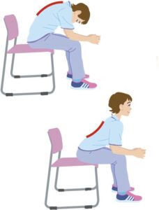 ①椅子に座って背中を丸めます。 顔をおへそにくっつけるようにすると丸くなりやすいです。 ②アゴを上に向けて胸を反らせます この時息は口から「ふーっ」と吐きましょう ③5回×3セット行いましょう