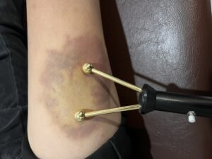 打撲で血腫が広がっているのとシコリがありましたので、エレサスをかけると細胞が活性化し修復作業が早くなります。